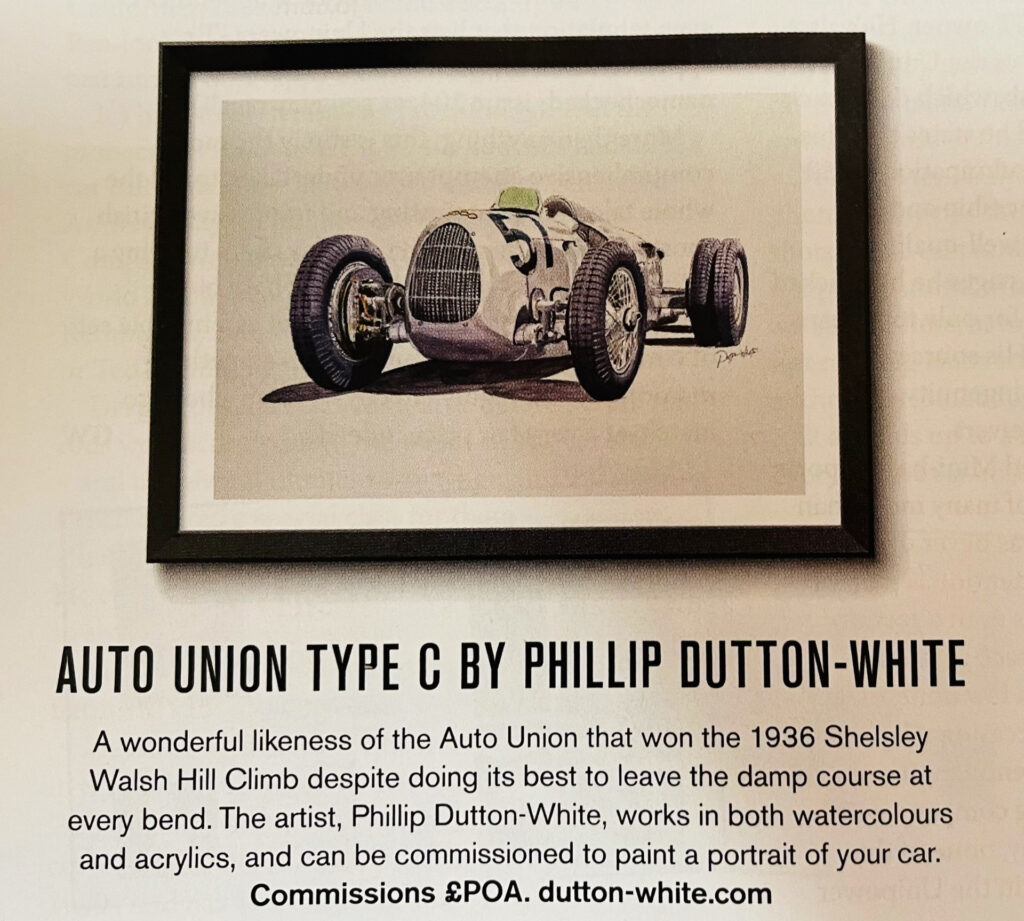 One of Phillip’s paintings of an Auto Union type C was featured in edition number 224 of “Octane” one of Europe’s premier Automotive magazines.